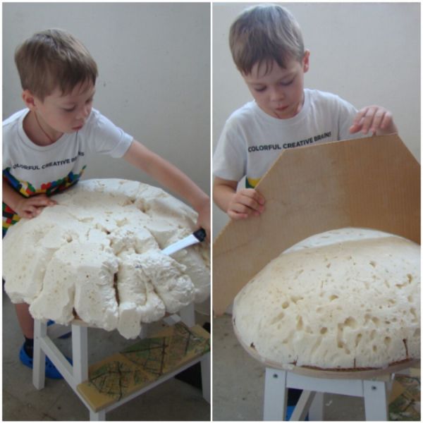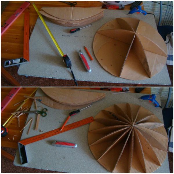 Из пустых коробок из под пиццы и при помощи клеевого пистолета сформировал каркас будущей шляпки гриба.
