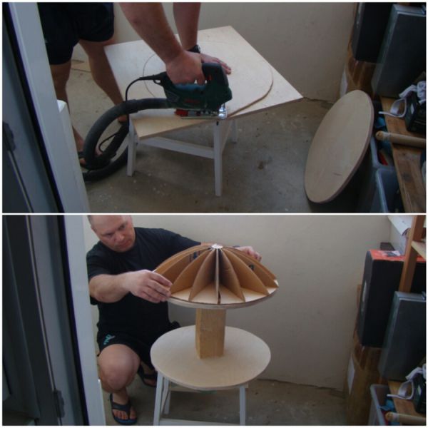 Затем, из 15-мм фанеры выпилил два круга для опоры ножки, нижнюю и верхнюю.
