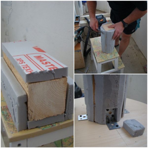 Приступил к изготовлению ножки из бруса 100*100 высотой 300 мм. Приклеил к нему технониколь, который остался после ремонта. Обрезал его по углам.