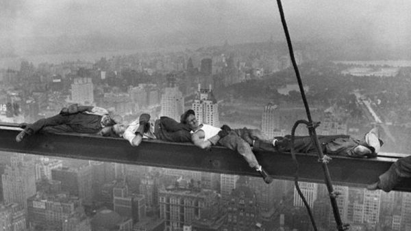Существовала такая история фотографии: Нью-Йорк, 1932 год. Одиннадцать работников, каждый из которых вместо нервной системы был еще при рождении оснащен стальными канатами, решили пообедать прямо на балке, висящей на четырехсотметровой высоте. Вот это смелость ! Эту фотографию видели наверное все.