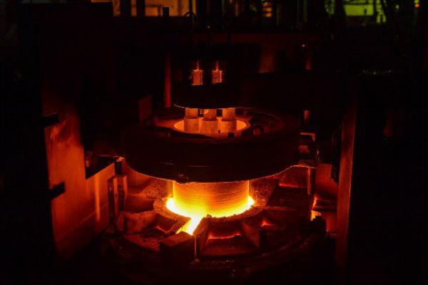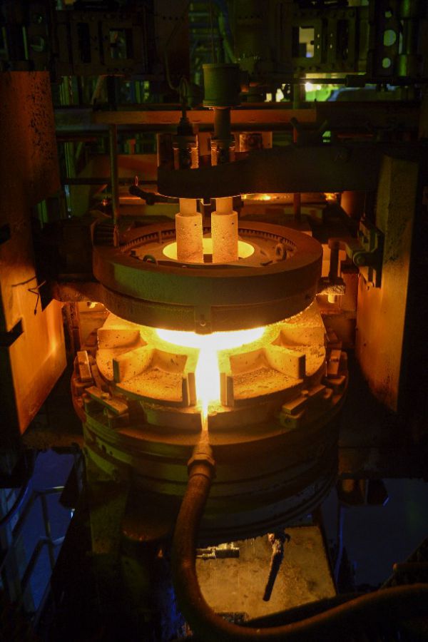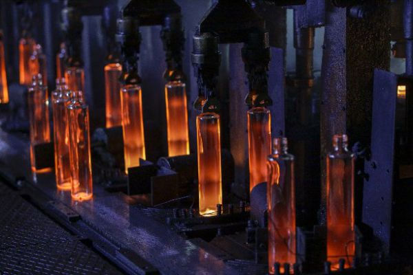 Стекло варится при температуре 1550-1560 градусов, а затем раскаленная масса попадает в фидер – воронку, через которую стекло каплей направляется в стеклоформующую машину.