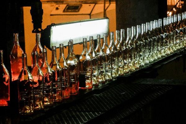 После стеклоформующей машины бутылка поступает на конвейерную ленту. Сначала температура изделия – 600 градусов, но затем она проходит печь обжига и холодное напыление.