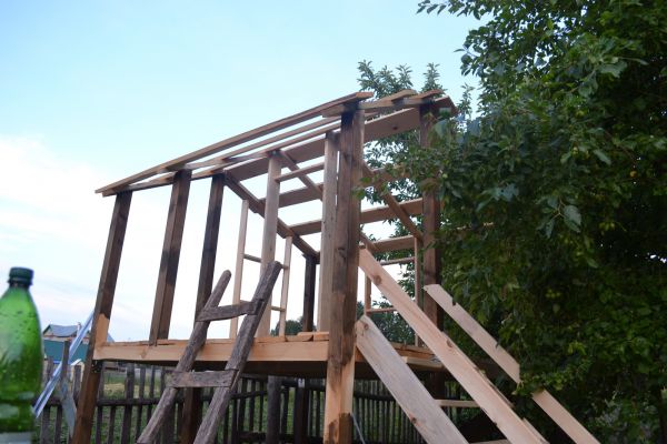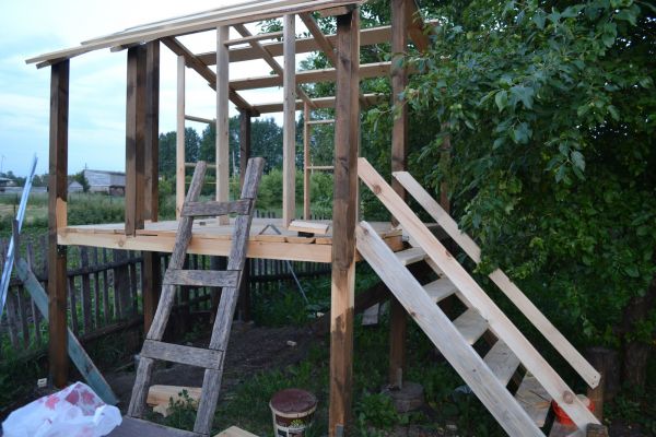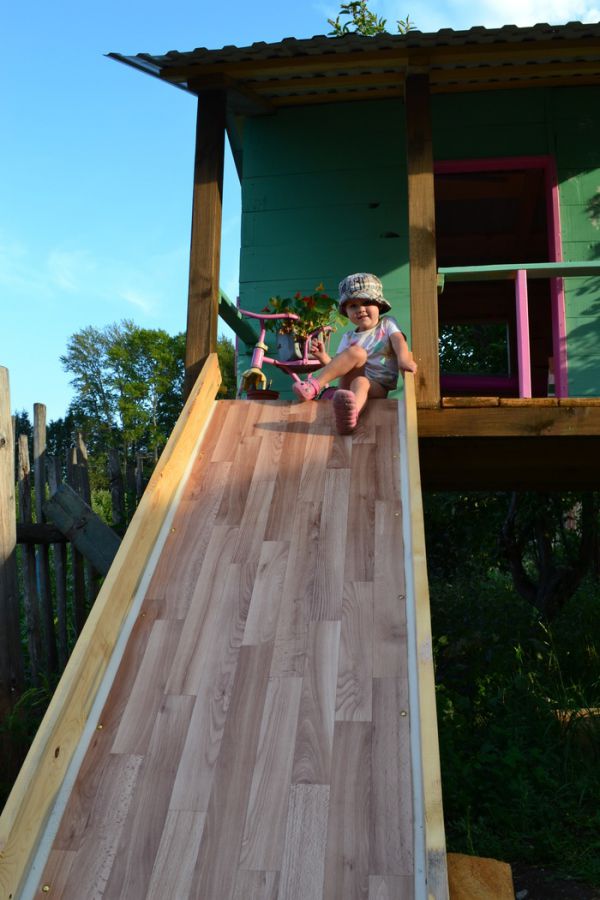 Как-то зимой дочь увидела по телевизору как строят детский дом на дереве. и спросила: "Пап, а ты сможешь? " "Легко, летом сделаю"- ответил я. И благополучно забыл. А дети они такие, они не забывают. Соответственно весной дочь озадачила меня: "Когда начнем строить домик на дереве". Пришлось объяснить, что на наших яблонях строить дома опасно. сошлись на домике на сваях с горочкой. Почитав кучу статей и просмотрев гигабайты роликов на соответствующих ресурсах, выбрал чертеж