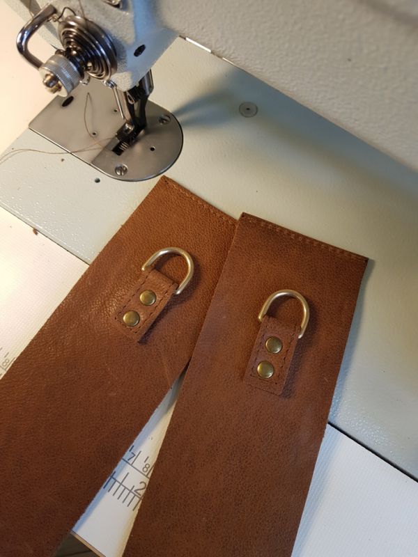 Прошиваю боковушки и петельки для ремня. Решил не мудрить и захольнитенить их. Предварительно прострочив лоскуты кожи.