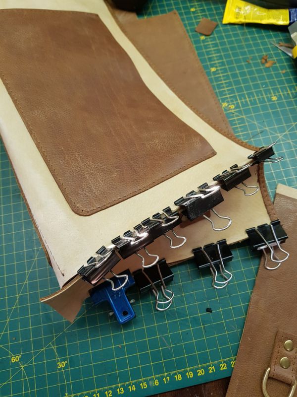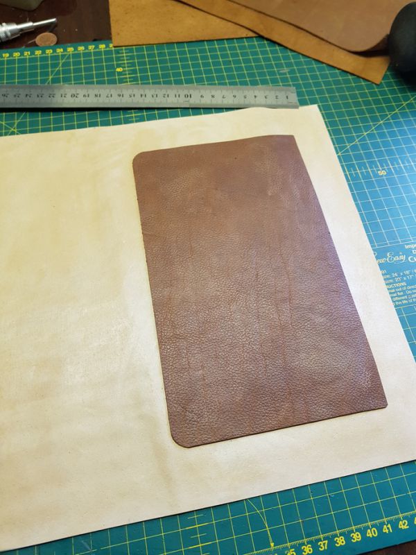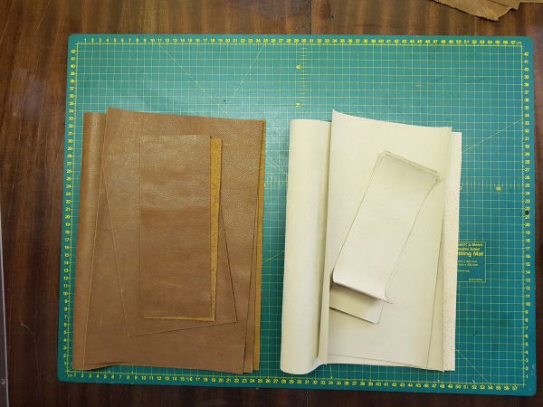Для начала вырезал основные детали. Кожу решил загнуть на обратную сторону, что бы прикрыть край и подклад, а заодно попробовать, как это вообще выглядит.