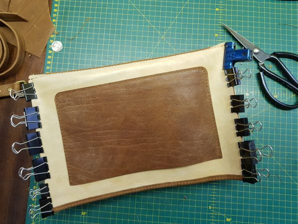 Начинаем собирать сумку навыворот, для начала просто на прищепках, а потом уже с клеем.