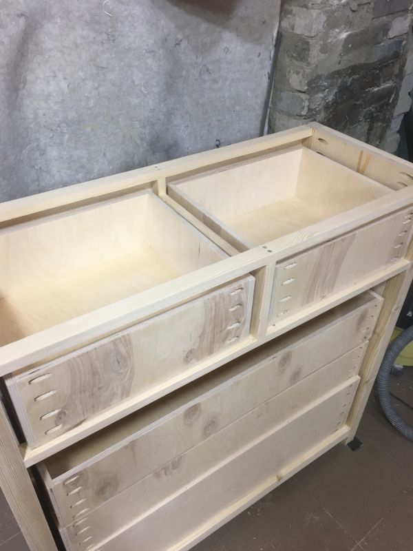 Напили ящиков. На один не хватило 12мм Фанеры, сделал из 18, дно везде 10мм - просто не было другой. Весь комод получился мягко говоря тяжелым