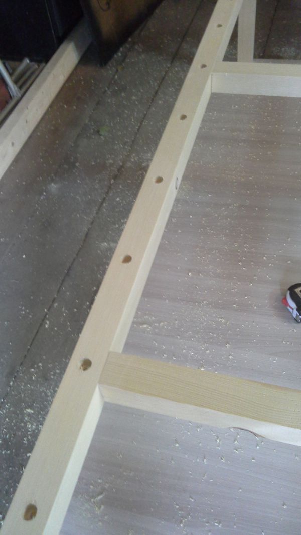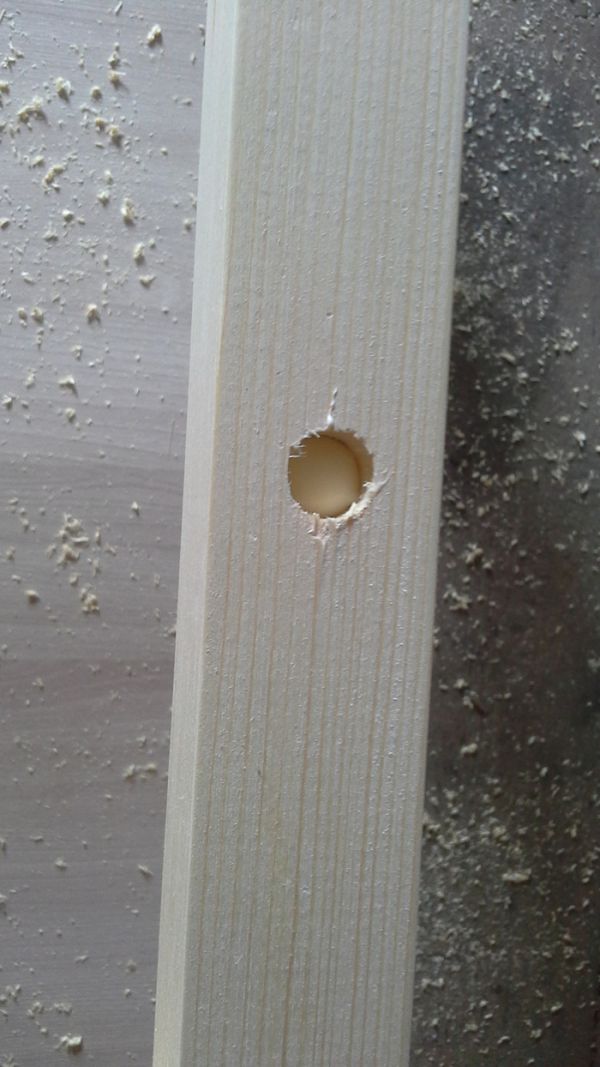 Отверстия под шканты засверливал "пером" диаметр 15 мм, как и у шкантов. В отверстия заливал столярный клей и кияночкой утапливал.
