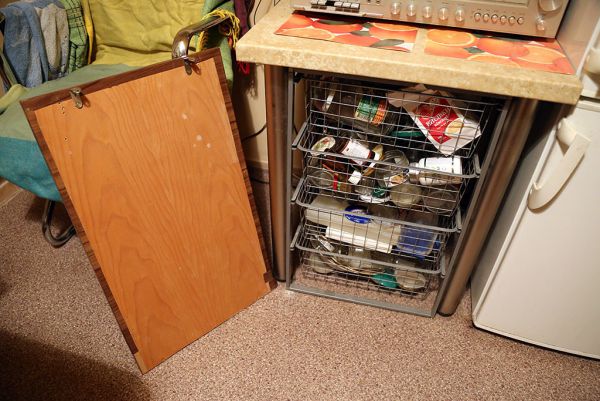 Еще одно решение на кухне. У меня оставался практически квадратный кусок от кухонной поверхности. Сначала я просто приделал ему ноги. Получился дополнительный столик. А потом обнаружил, что оставшаяся от родителей металическая стойка с ящиками идеально становится под этот столик. Но надо было ее чем-то прикрыть. Переднюю панель я сделал из куска стенки от старого шкафа, обклеив его с наружной стороны пленкой под цвет низа кухни и навесив на железную стойку на двух подогнутых плоскогубцами уголках -