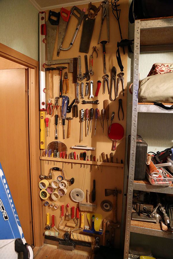 Одна комната у меня отведена под склад-гардеробную. В ней стоят шкаф-купе и стелажи, хранится оборудование для виндсерфинга (доски, паруса, гики), горыне лыжи, рюкзаки и многое другое. А при входе сделана вот такая стенка для хранения инструментов -