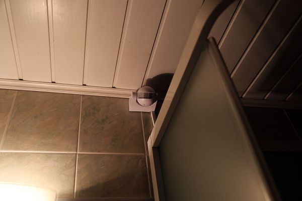 Но вот в ванной с ним связана целая история. Началось с того, что когда я собирал кухню, я заметил под потолком в ванной над стиральной машиной свободную пару проводов. Видимо там раньше был еще один плафон. Тут мне пришла идея провести провод вниз в коробе и поставить розетку для стиральной машины (раньше подключалась через удлиннитель из коридора), а посредине пути просверлить дырку в стене на кухню и подключить вытяжку. Сказано - сделано. И вот я довольный включаю стиральную машину, выключаю свет в ванной и ... стральная машина остнавливается. А также не работает вытяжка в кухне. Я как-то сразу не сообразил, что оба плафона были на последовательном проводе, заведенном на один выключатель. Вот тут и родилась идея поставить датчик движения. Теперь выключатель все время включен, а стиральная машина и вытяжка на кухне работают и при не горящем в ванной свете. Бинго! Но и это еще не все. Первоначально я расположил датчик над плафоном слева от душевой кабины, рассчитывая, что датчик будет через полупрозрачное чтекло реагировать и на движение внутри кабины. Не тут-то было! В результате приходилось в процессе принятия душа приоткрывать дверь кабины, высовывать руку и махать ею, чтобы датчик включил свет. В результате пришлось перевесить датчик на его нынешнее место - над боковой стенкой кабины, чтобы он "видел" движение и внутри ее.