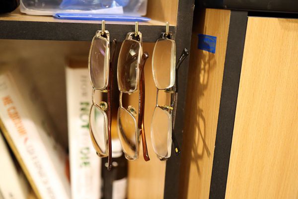 Вечная проблема, когда есть несколько пар очков - для вождения-хождения, для компьютера, для чтения, - это их поиск. Поэтому у них тоже должно быть постоянное место. Проблема решена так - крючки в полке на моем рабочем столе -