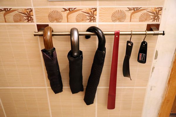 Второе место - в коридоре. Зонты и рожки для обуви нали свое постоянное место (ремонт еще идет, так что не обращайте внимание на стену справа) -