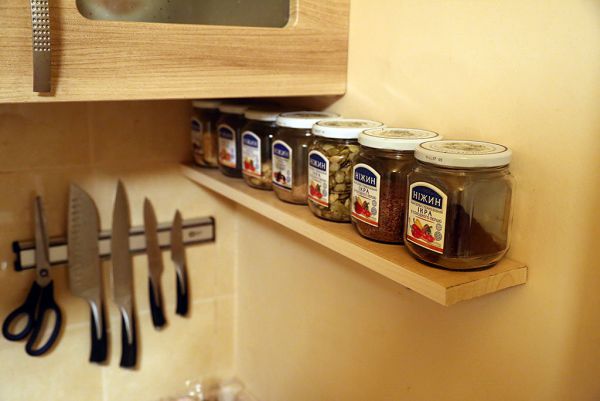 Из последнего. Покупал в Le Silpo в красивых стеклянных банках разные овощные салаты. Когда банок скопилось штук семь, родилась идея хранить в них всякое рассыпное (молотый кофе, семена льна - зерна и молотые зерна, орехи, тыквенные семечки, фасоль, грецкие орехи и т.д.) и сделать для них сбоку кухни дополнительную полку -