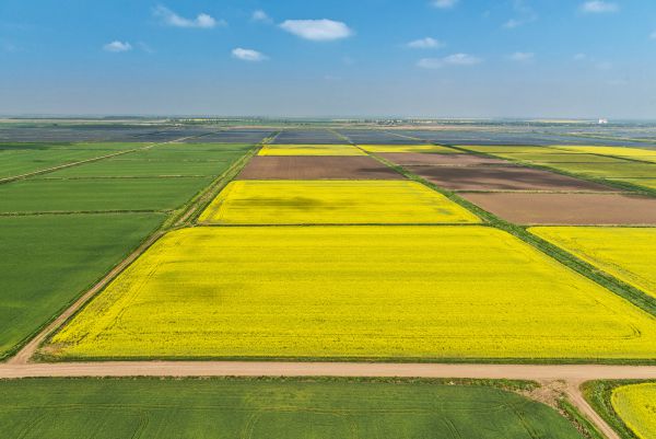 Опрыскивание и подкормка проводятся большей частью с помощью малой авиации. Желтые сектора – это цветущий рапс, участник севооборота.