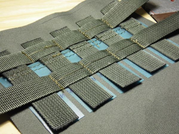 Оптимизация. Упрощать желательно все, что может быть упрощено. Результатом таких действий порой становятся приспособы, как на фото ниже. В данном случае пришиваются стропы для крепления подсумков и прочего навесного. Используется стандарт molle (есть аналоги alice и pals). И чтобы каждый раз не отмерять промежутки, пришлось немного подвигать извилинами. Зато теперь пришить очередную стропу проще простого.