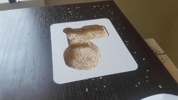 Как видите при помощи импровизированного шаблончика получилось сделать вот такое углубление. чтобы не ослабить лицевую поверхность углубление под плату сделано не таким глубоким, а остаточная толщина столешницы в месте расположения катушки 2 миллиметра.