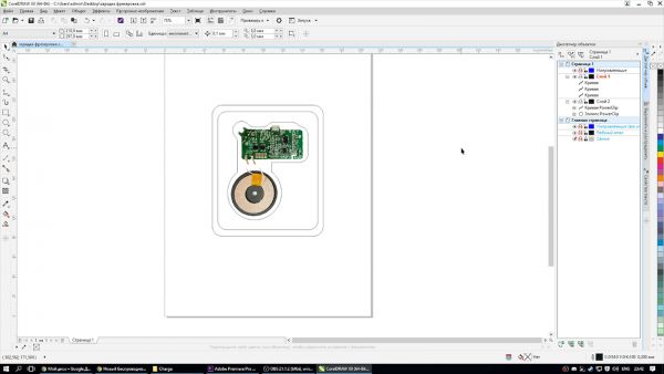 Для удобства обработки углубления с обратной стороны столика я нарисовал контур обработки чуть больше размеров катушки и платы нашей зарядки.