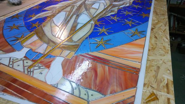 Пока я всем этим занималась, изготавливалась металлическая рама. Состояла она из двух частей, одна крепилась к стене, ко второй крепился витраж на герметик и клей. Между стеклом прокладывается резинка для амортизации. Заказчик хотел, чтобы витраж открывался, выполнено.