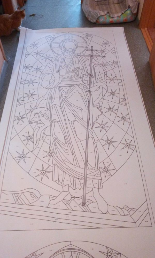 Распечатываю картон в натуральную величину, в двух экземплярах.На одном я буду выкладывать кусочки стекла и шлифовать на машинке, чтобы детали идеально прилегали друг к другу, а второй я режу по контуру для шаблонов. Потом по этим шаблонам буду вырезать свои стекла.Вот такой он огромный витраж, по сравнению с котом, хотя я считаю его жирненьким))