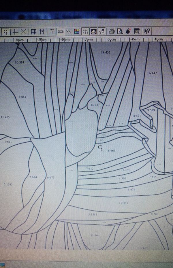 Далее делаем прорисовку будущего витража. Я делаю в glass eye 2000, крутая программа! Но только для прорисовки витражей, в ней удобно рассчитать количество материалов и делается пронумеровка каждого цвета и его количества.