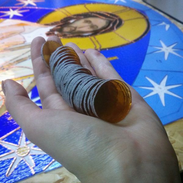 Приступаю к работе, вырезаю стекла разных оттенков по шаблонам. Стекло специальное, для витражей, разных цветов, текстур и светопропускаемости.