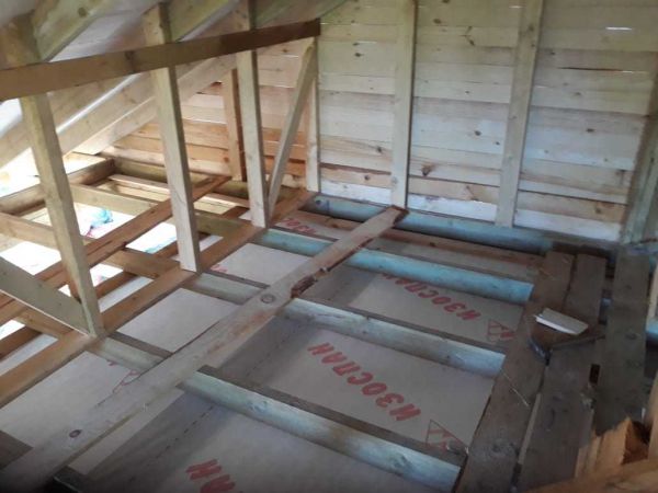 Пол-шпунтованная доска. Между Черновым и чистовым полом- изоспан и утеплитель роквул.