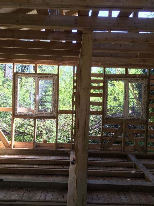 В процессе смонтировали окна. Каркасный дом позволяет монтаж окон после подведения каркаса под крышу. Окна rehau двухкамерные.