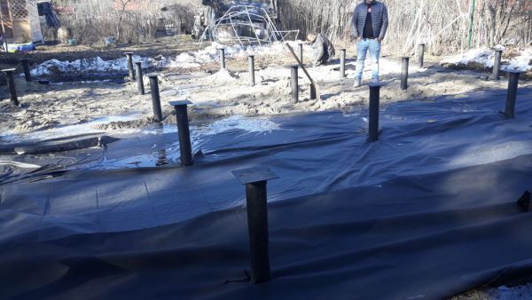 Свайное поле засыпано песком, сверху геотекстиль, сверху ещё слой песка ( от влажности земли)