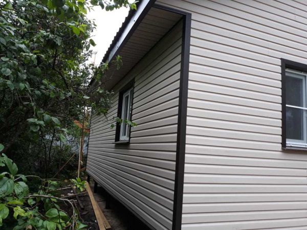 Сайдинг виниловый гранд лайн, фактура имитирует окрашенное дерево, откосы и отливы металлические с напылением, аналогичной фирмы.