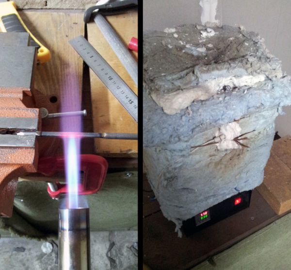 2) суем гвоздь в электропечь (если приглядеться на фото ниже можно увидеть его шляпку). Это уже проще, гвоздь прогревается равномерно до заданной температуры, после чего его можно не спеша достать, сунуть в тиски и закрутить как надо;