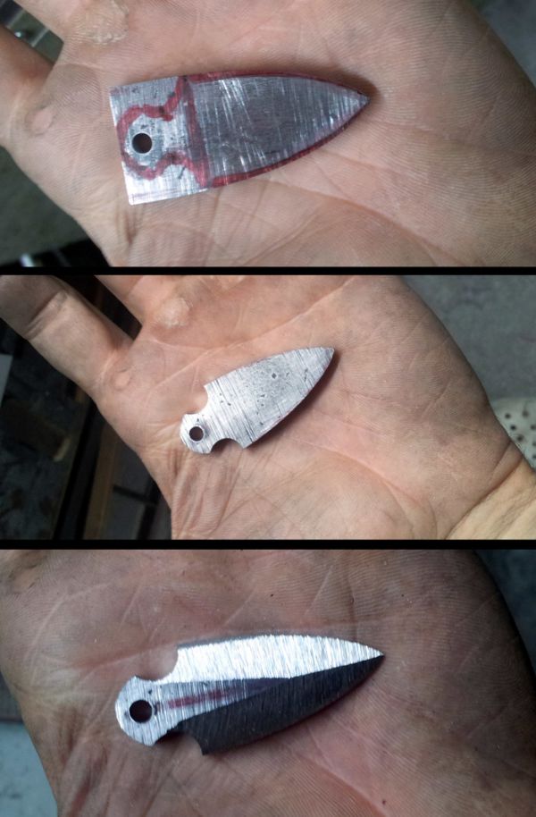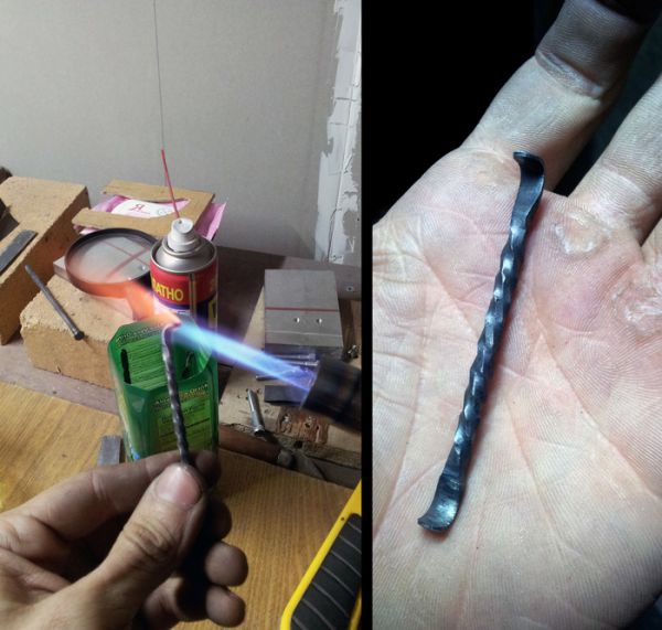 Отрезаем лишнее, обтачиваем будущие ушки и загибаем их. Для более точно контроля можно нагревать нужные участки горелкой, хотя гвоздевой металл такой толщины можно и на холодную гнуть без проблем, но мне просто необходимо вставить еще одну фотку с горелкой!