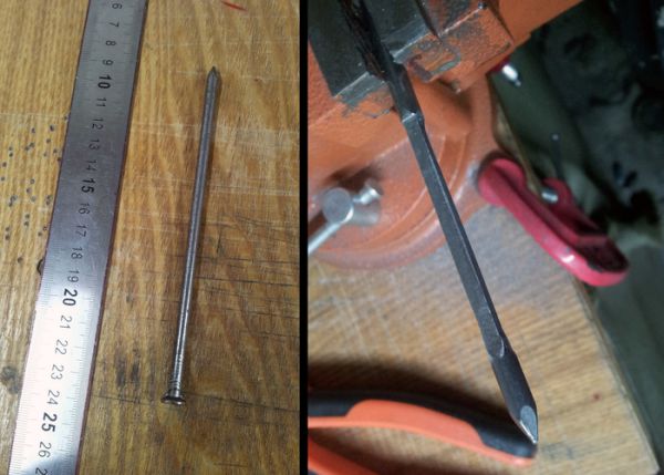 Нам потребуется гвоздь, а еще нам потребуется обточить его часть до квадратного сечения (это быстрее, чем колошматить его молотком, хотя не так весело)