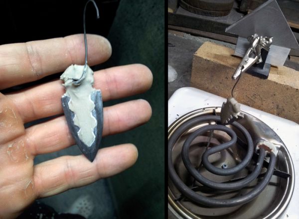 После суток просушки она уже достаточно крепко сидит, чтобы не пачкать все вокруг и не отваливаться от детали, но при этом еще легко обрабатывается. Придаем обмазки нужный вид и досушиваем (если никуда не спешите, можете просто дать мастике высохнуть самой, на это уйдет около трех суток). Я использовал электрокомфорку, но можно сушить чем угодно, лишь бы был контроль температуры. При досушивании нужно смотреть, чтоб не было больших пузырей, прижимаем все вздутости обратно, если таковые будут. Сохнуть будет часа два с постепенным повышением температуры, а под конец можно еще газовой горелкой для верности пройтись.