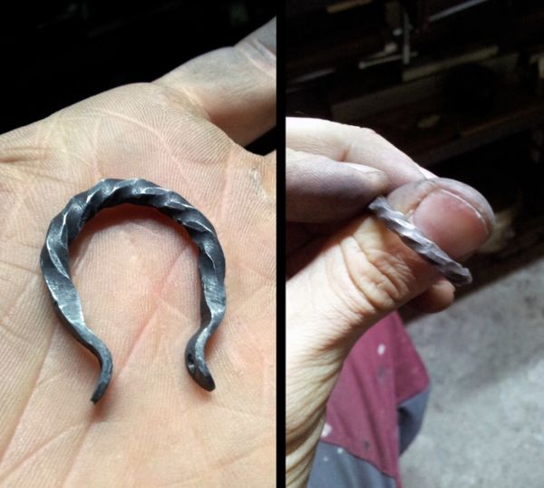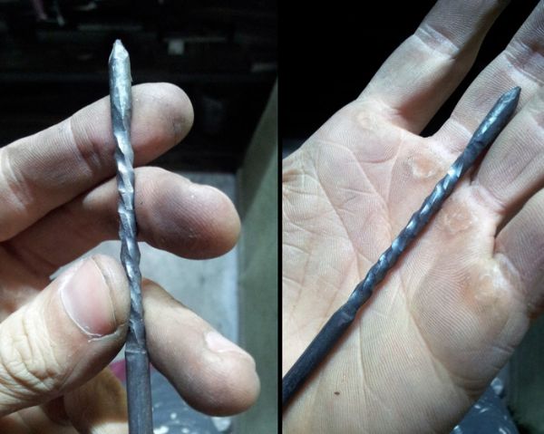 В итоге имеем завитый гвоздь, что уже симпатишно, но можно все улучшить: нагреваем и обстукиваем витки молотком до придания легкого квадратоподобия (прикольно звучит, если быстро произносить) в сечении. Степень квадратоподобия каждый выбирает исходя и эстетических чувств, мне хватило легкой степени):