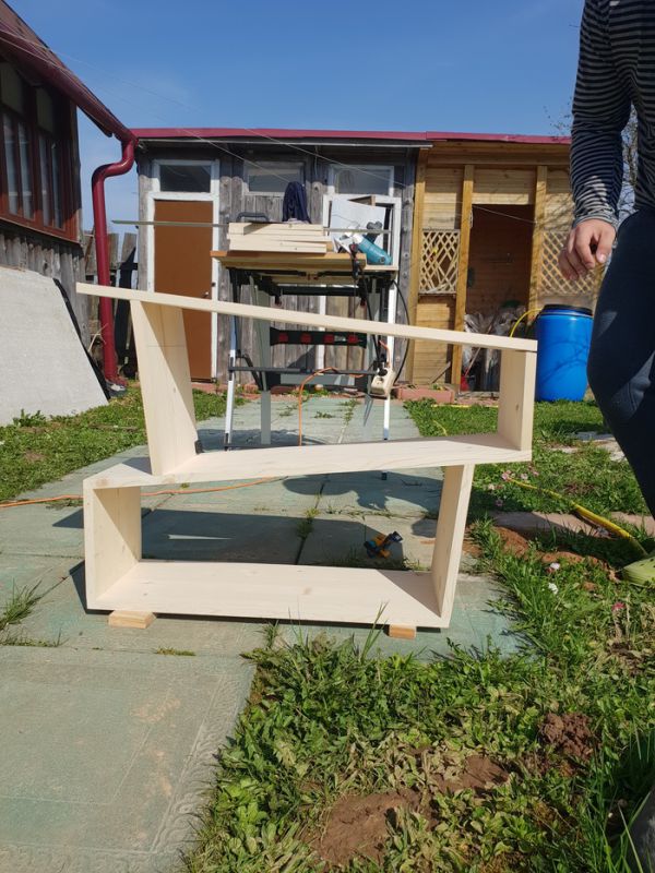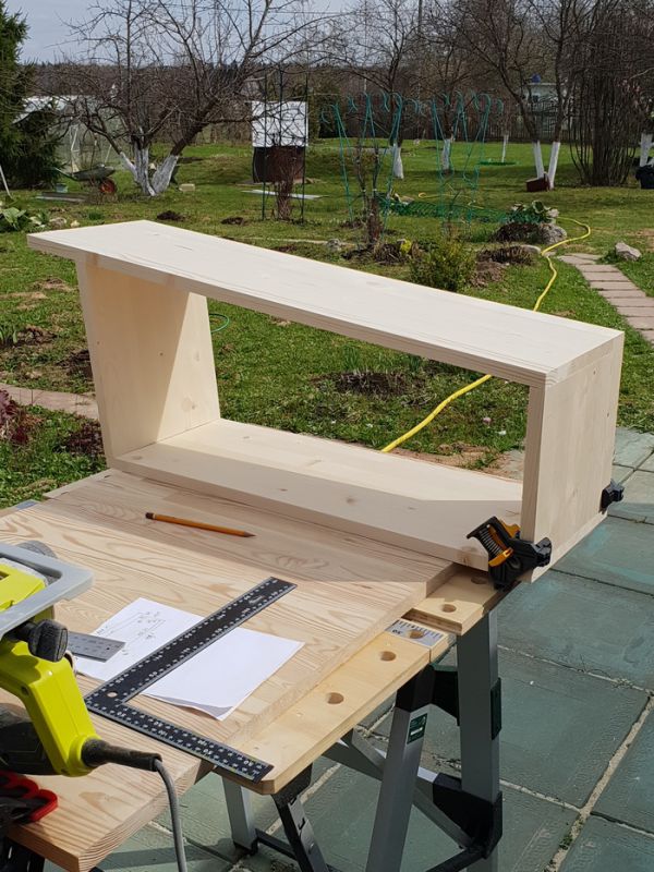 На фотографии можно заметить, что верхний угол "второго этажа" имеет щель. Возникла она не от ошибки угла, а от того, что хвойный мебельный щит был не весь ровный. Некоторые доски были "винтом", другие "веслом". У меня нет ни рейсмуса, ни фуганка, поэтому я пытался ровнять доски шлифмашинкой - получилось вполне ничего.