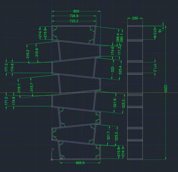 Вторая версия полки лишилась симметрии для осей вертикальных опор относительно середины конструкции. Так показалось мне более правильным, так как размеры от края полки до наклонной опоры не менялись на каждом следующем этаже. (да-да, я всегда умел сложно объяснять простые вещи :) )