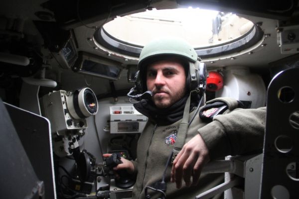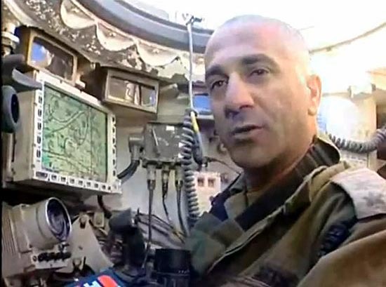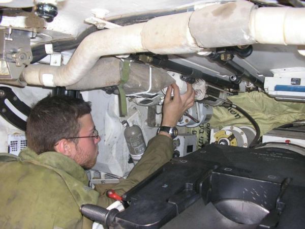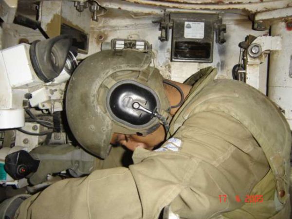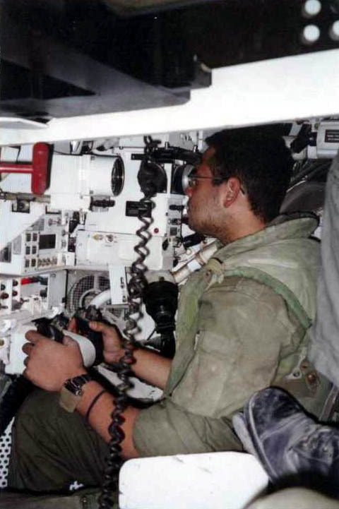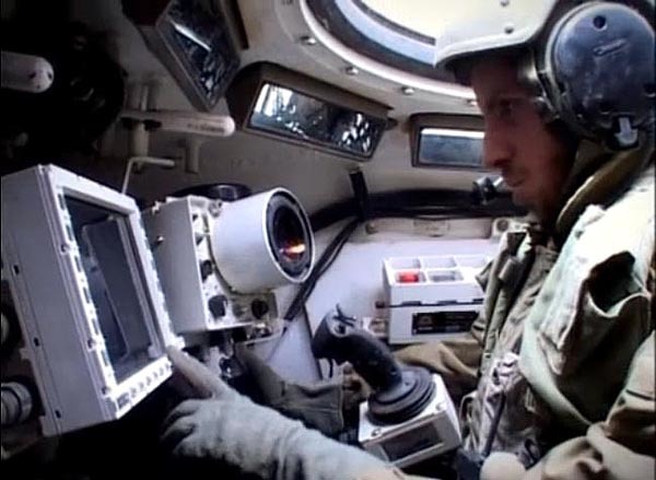 "Наводчик Merkava Mk.3. Его взгляд устремлен в визир прицела под которым расположен блок управления лазерным дальномером. Визир слева - тепловизионный канал. Помимо джойстика, под правой рукой этого башнера находится рукоятка привода башни."