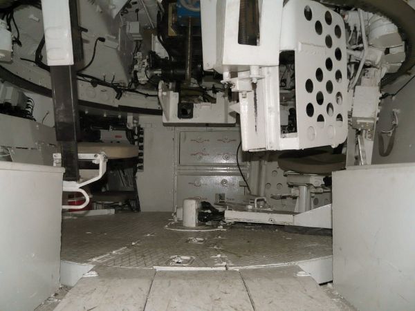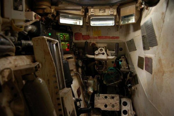 "Место механика-водителя с другого ракурса. Сравнительно узкое место этого члена экипажа обусловлено компоновкой: за правой перегородкой находится двигатель"