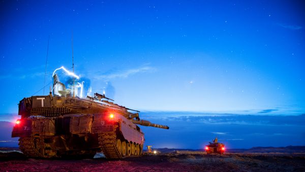 "Merkava Mk.4 на ночных стрельбах. На корме башни крепятся цепи с грузами, которые выполняют роль противокумулятивных экранов"