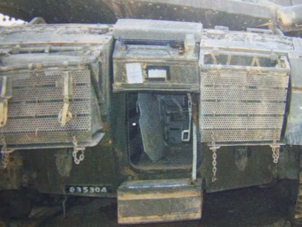 "Вид на десантную аппарель в кормовой части корпуса. Этот отсек может вместить носилки с ранеными, дополнительный боекомплект или шесть пехотинцев. Такое совмещение танка и БМП - это следствие доктрины "вялотекущей войны"