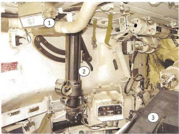 "1 - перископический прибор наблюдения заряжающего. 2 - 60 мм миномет, позволяющий вести огонь осколочными, дымовыми и осветительными минами. 3 - казенная часть орудия"