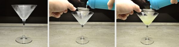 Выбрасываем лед из бокала, и через сито переливаем содержимое шейкера в охлажденный бокал: