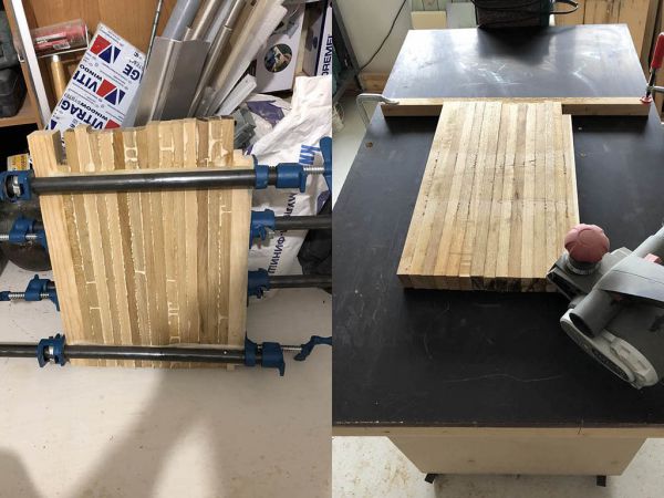 Забыл сразу приклеить обрезок соснового бруска, чтоб на выходе из рейсмусового станка не вырывало щепки с крайней планки. После рейсмуса обрезал в размер.