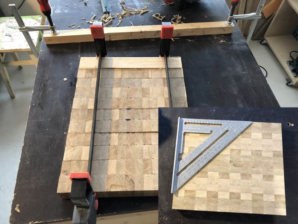 Из дубовых обрезков, оставшихся от ступеней, решил сделать торцевую разделочную доску. Выбрал несколько подходящих и прогнал через рейсмусовый станок.