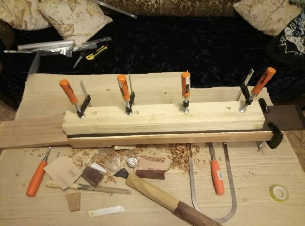 Далее кратко: придаю форму голове, делаю радиус накладки, вставляю лады.