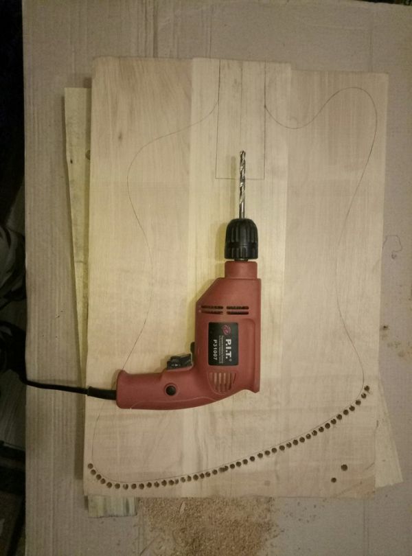 Чертежи делал в AutoCAD, распечатал в масштабе 1:1. Дерево, клей и лады заказал в интернет магазине бридж и колки у дяди суньхуйвчая. Колки в итоге все выкинул и заказал немецкие Schaller. Бридж теперь тоже буду менять, заказал у токаря (или фрезеровщика) новый из стали. Электроника полностью американская: звучки - EMG TBDC (именно тандербёрдовские по звуку и форме, только активные); кишки тоже EMG. Без эквалайзера, традиционные две громкости и общий тон.