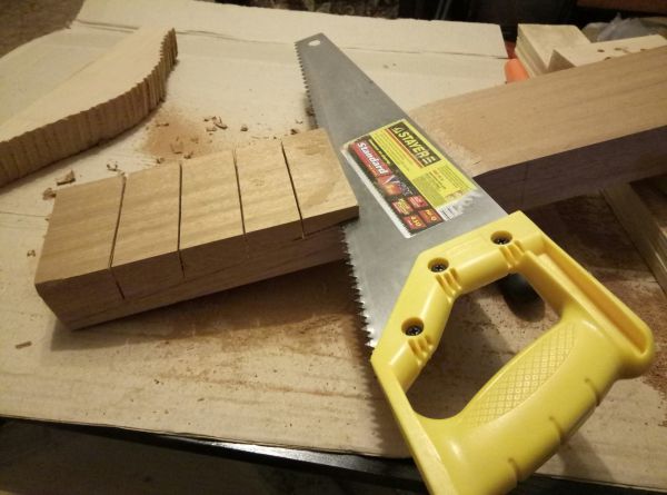 Центральную "ступеньку" сделал, отпилив тонкую дощечку от заготовки для грифа из махагона.