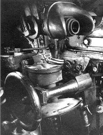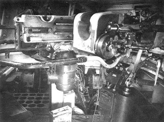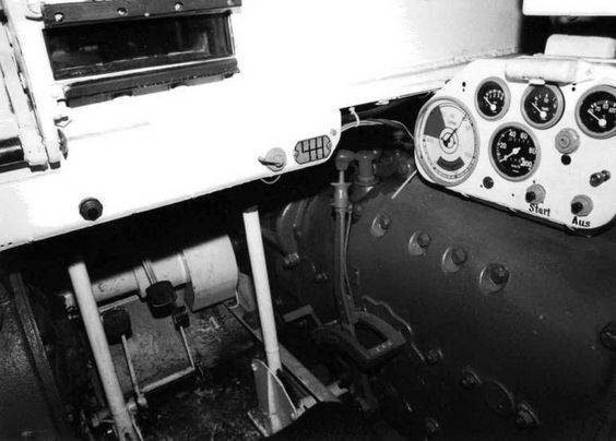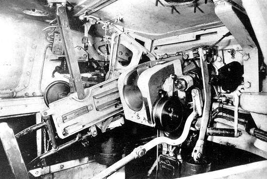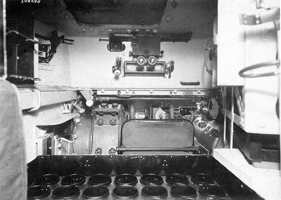 "Вид на место водителя с позиции наводчика. Над смотровой амбразурой опущен бинокулярный визир перископического прибора наведения, использовавшийся при закрытии обзорной амбразуры. При ненадобности, он сдвигался вправо. Слева виднеется смотровая амбразура в стенке корпуса, от которой позже отказались. На фото - Ausf.F2"