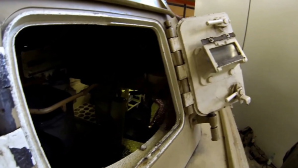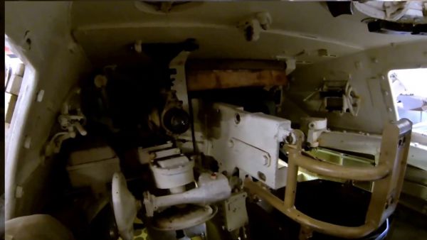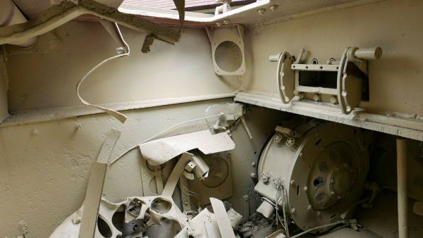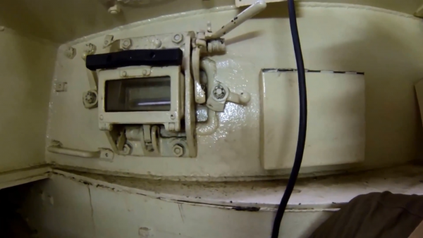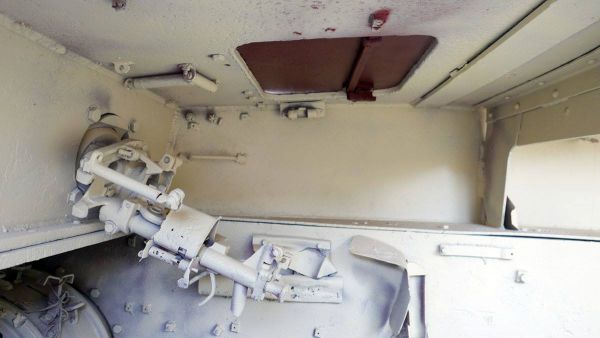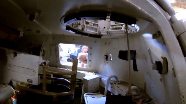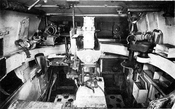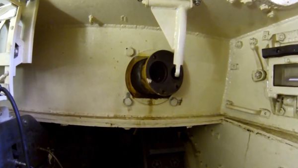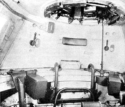 "Вид на место заряжающего. На ранних модификациях приборы наблюдения были в люке, и передней боковой стенке башни"